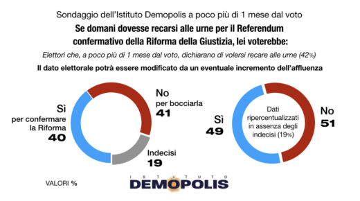 Se si votasse oggi – con un’affluenza stimata al 42% – il 40% degli italiani voterebbe a favore della Riforma, il 41% la boccerebbe. Con quasi un quinto di elettori ancora incerto sulla scelta. Se si ripercentualizzano i dati in assenza dei tanti indecisi, il “No” con il 51% prevarrebbe oggi di misura sul “Sì”, attestato al 49%.