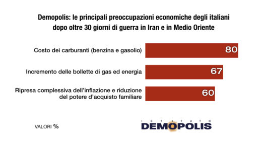 Sul clima del Paese incombono intanto i crescenti timori economici delle famiglie, aggravati dalle conseguenze del conflitto in Medio Oriente. L’80% si dichiara preoccupato dall’aumento rilevante dei costi di benzina e gasolio, 2 italiani su 3 dall’incremento delle bollette di gas ed energia.