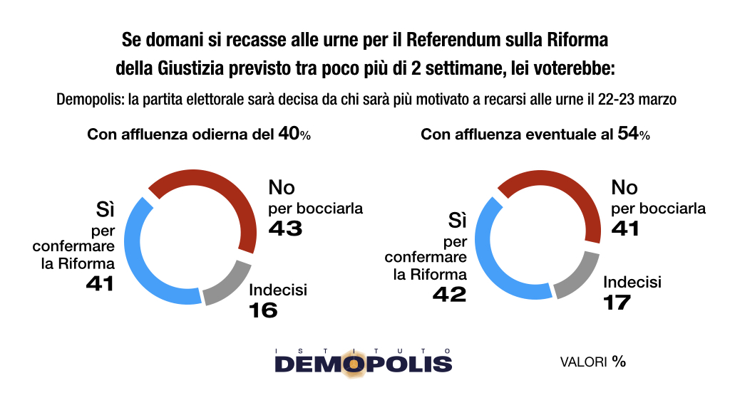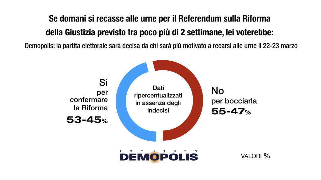 Ripercentualizzando i dati in assenza degli indecisi, il No – con una forbice tra il 55 ed il 47% – prevarrebbe oggi di misura sul Sì, attestato tra il 53% ed il 45%. È una fotografia destinata ovviamente a modificarsi nelle prossime 2 settimane.