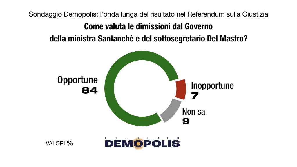 L’84% degli italiani valuta positivamente le dimissioni del sottosegretario Andrea Del Mastro e del ministro del Turismo Daniela Santanchè.