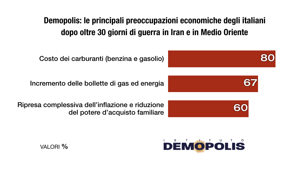 Sul clima del Paese incombono intanto i crescenti timori economici delle famiglie, aggravati dalle conseguenze del conflitto in Medio Oriente. Secondo i dati Demopolis, l’80% si dichiara preoccupato dall’aumento rilevante dei costi di benzina e gasolio, 2 italiani su 3 dall’incremento delle bollette di gas ed energia. Il 60% teme una ripresa complessiva dell’inflazione, con un’ulteriore riduzione del potere d’acquisto, già messo a dura prova negli ultimi anni.