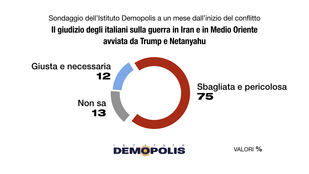 Conseguente risulta il duro giudizio negativo dell’opinione pubblica sulla guerra in Iran avviata da Trump e Netanyahu. Sbagliata e pericolosa per 3 italiani su 4 intervistati dall’Istituto diretto da Pietro Vento: si tratta di una valutazione sempre più trasversale.