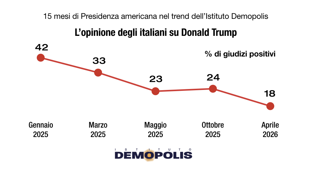 Le pesanti conseguenze del conflitto e la percezione di una difficile soluzione a breve fanno crollare le già poche simpatie degli italiani nei confronti del Presidente americano: le opinioni favorevoli, che 15 mesi addietro si attestavano – nei dati Demopolis – al 42%, si riducono oggi al 18%. Ormai residuali perfino tra gli elettori dei partiti della maggioranza.
