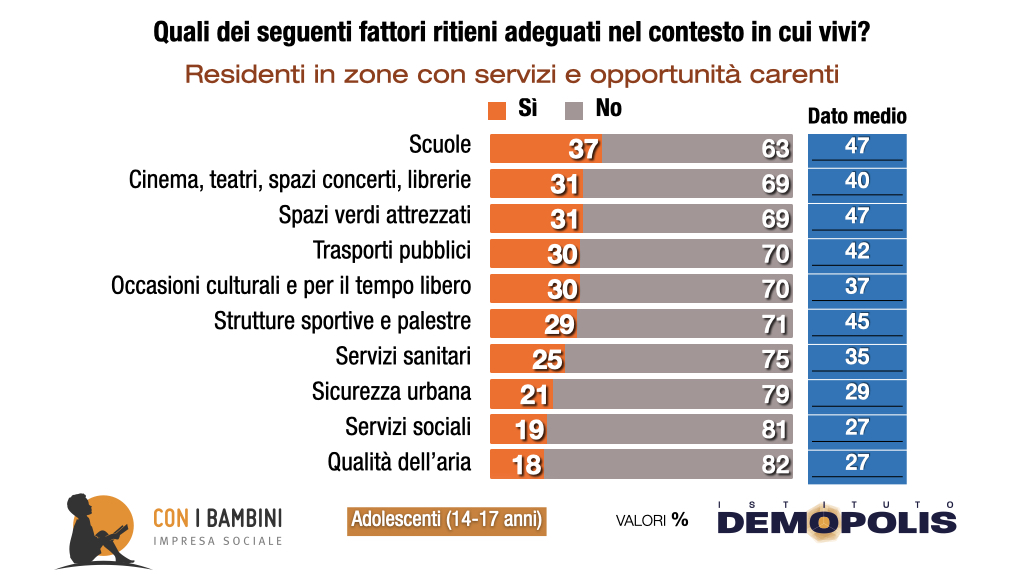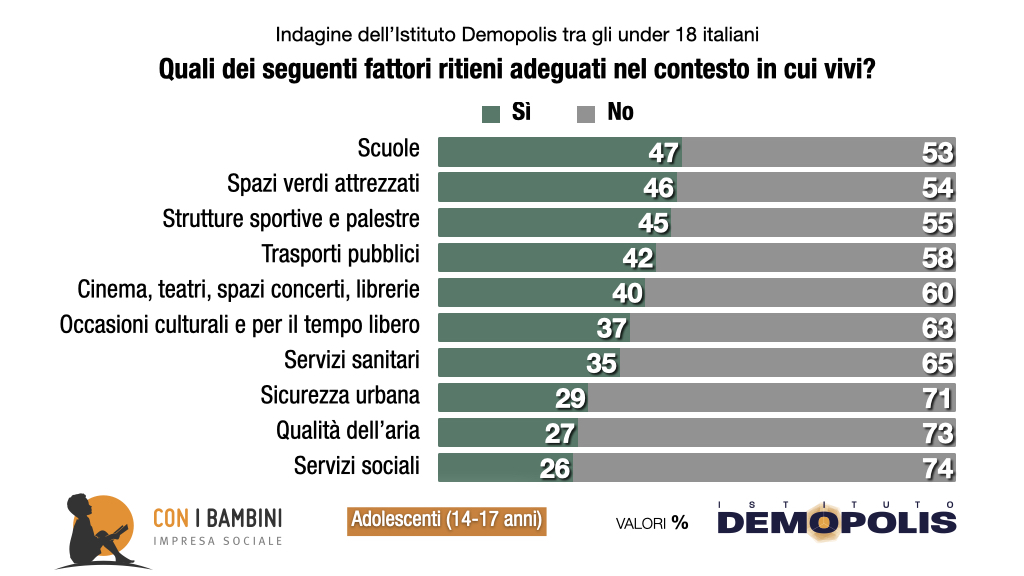 Secondo gli adolescenti intervistati, le città italiane non sono a misura di minori: meno della metà del campione analizzato ritiene che siano adeguati spazi verdi, scuole, strutture per lo sport, trasporti pubblici. Meno del 30% valuta sufficienti la sicurezza urbana, la qualità dell’aria, i servizi sociali. E, fra i ragazzi che dichiarano di vivere in periferie e quartieri difficili, le valutazioni scendono di oltre 10 punti per tutte le variabili analizzate: oltre i 2/3 ritengono inadeguati servizi sociali e sanitari, occasioni per il tempo libero, sicurezza urbana”.