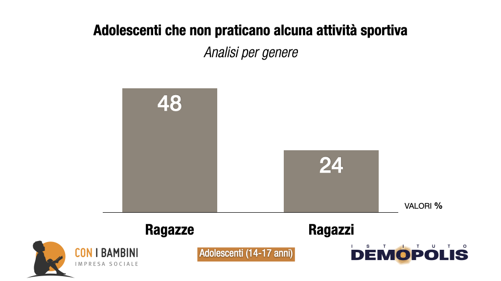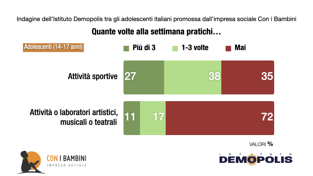 Le diverse analisi, condotte a partire dal 2019, hanno valutato quale motore fondamentale di relazioni e crescita siano le attività extrascolastiche. In generale, in Italia, l’eventualità che i 14-17enni le pratichino non è scontata e risulta talora residuale: il 72% non svolge attività o laboratori musicali, artistici o teatrali; oltre un terzo (35%) non pratica alcuna attività fisica o sportiva, con un dato che cresce fra le ragazze fino al 48%.