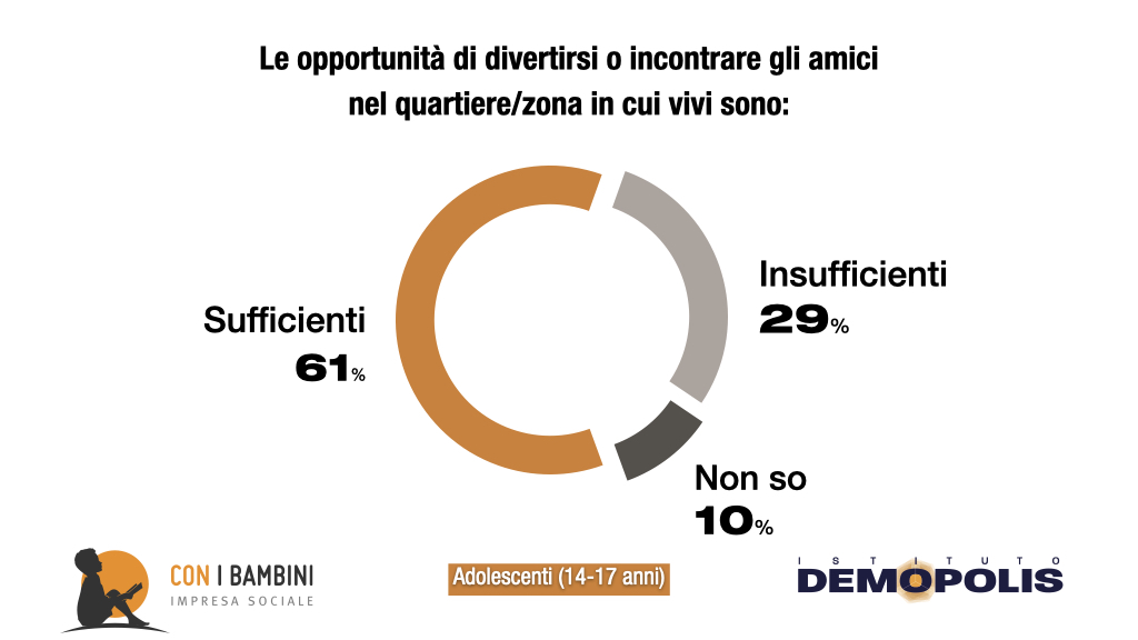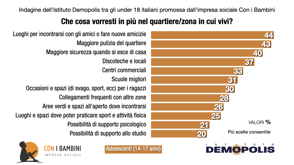 Eppure, se dovessero scatenare fantasia e desideri su che cosa vorrebbero in più e di meglio nel proprio quartiere di residenza, gli adolescenti rispondono con dichiarazioni di pragmatismo a tratti sorprendenti: serve ripartire dai prerequisiti minimi. Servirebbero luoghi per incontrarsi con gli amici o fare nuove amicizie (44%), ma anche maggiore pulizia (43%) e sicurezza nella propria zona (40%), con dati che si inaspriscono nei quartieri più complessi e nelle periferie delle città italiane.