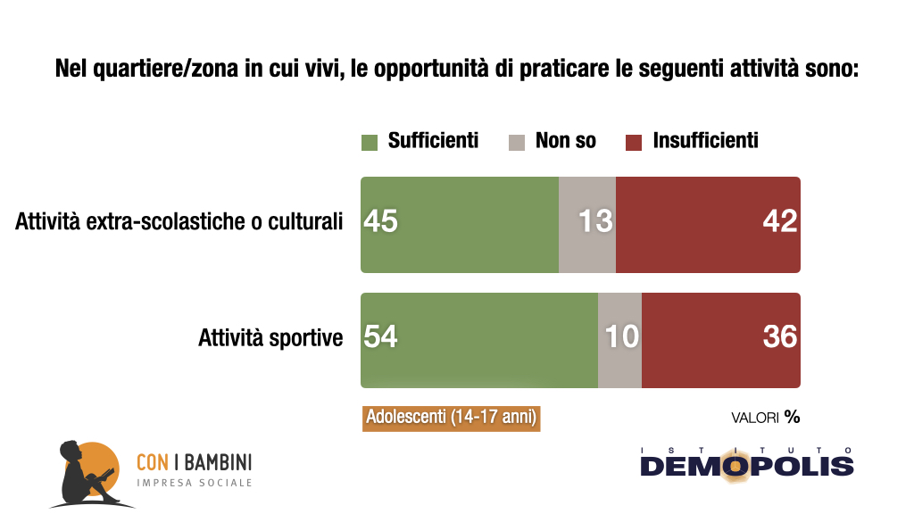 Ma la possibilità di praticare attività extrascolastiche nel proprio quartiere di residenza non vale per tutti gli adolescenti allo stesso modo. Nelle zone “difficili”, la dimensione di opportunità dichiarata dai ragazzi residenti crolla di oltre 30 punti, sia per le attività ludiche e culturali che per lo sport.