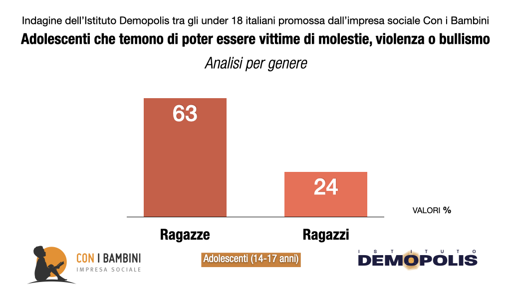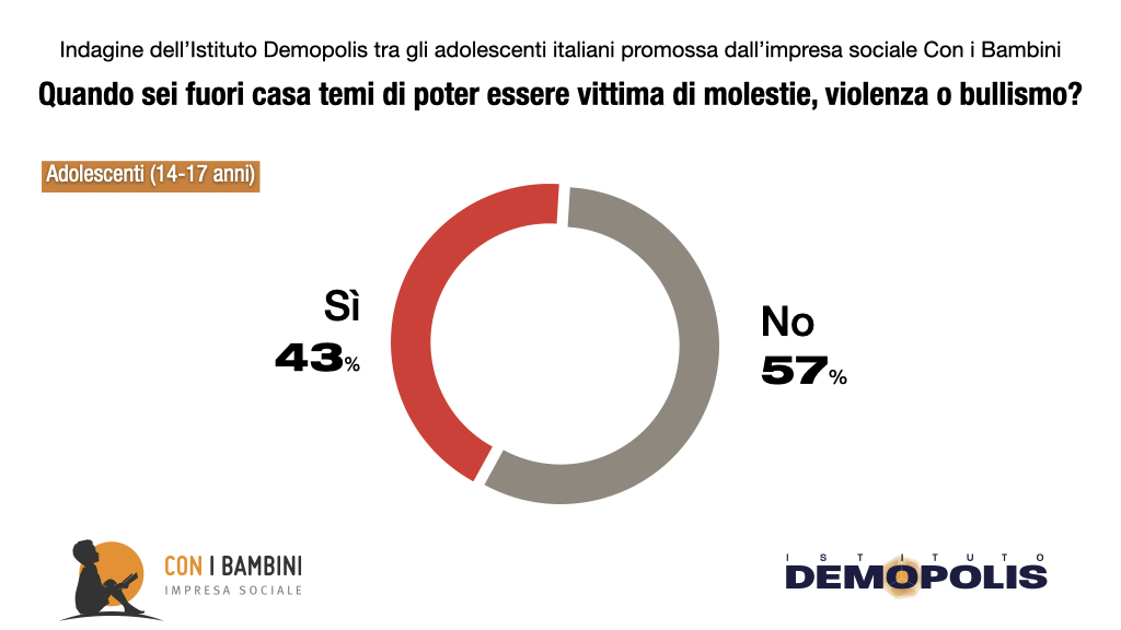 Vivere al sicuro per gli adolescenti italiani non è infatti scontato. Il 43%, quando si trova fuori casa, teme di poter essere vittima di molestie, violenza o bullismo, con un dato che sale al 59% nei quartieri difficili ed al 63% fra le ragazze italiane nel complesso. Fra i genitori – interrogati a specchio nell’indagine Demopolis-Con i Bambini –, il timore per i figli raggiunge il 77%. Del resto, nella percezione generale della popolazione (46%), gli episodi di violenza fra giovani o da parte di baby gang sono sempre più frequenti.