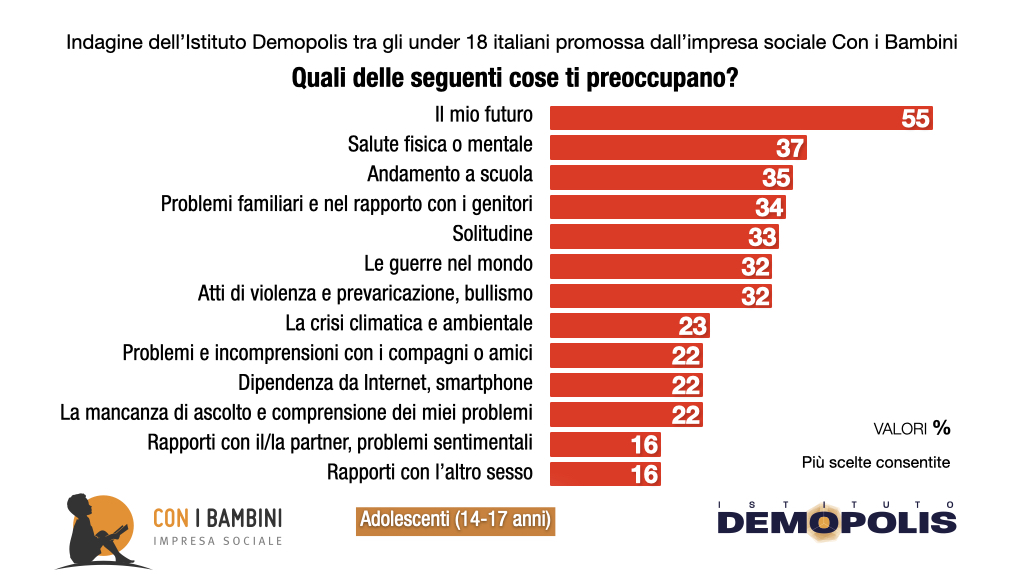 Nelle risultanze dell’indagine, in termini generali, il futuro è la prima ragione di preoccupazione per il 55% degli under 18, ma al secondo posto i ragazzi citano oggi la salute fisica o mentale (37%), un tema che Demopolis ha iniziato ad intercettare fra i più giovani negli anni dell’emergenza Covid e che non tende a perdere centralità. Restano personalissime le altre principali ragioni di preoccupazione dei ragazzi; solo le guerre nel mondo, al sesto posto, con il 32% di citazioni, rappresentano un’angustia di respiro collettivo.