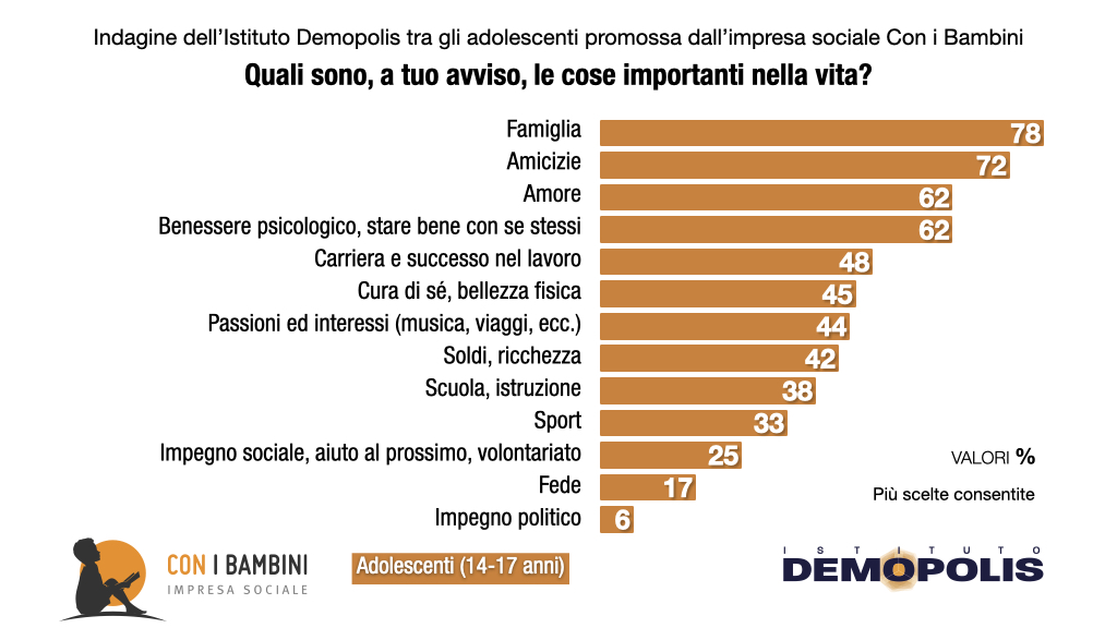 La graduatoria delle “cose importanti” della vita stilata dai ragazzi ne è testimonianza. Credono nella famiglia (78%) e nell’amicizia (72%), come dimensioni centrali dell’esistenza. Ma sul podio delle “cose importanti della vita” fanno salire anche il “benessere psicologico”, lo stare bene con se stessi, a pari merito con l’amore (62%).