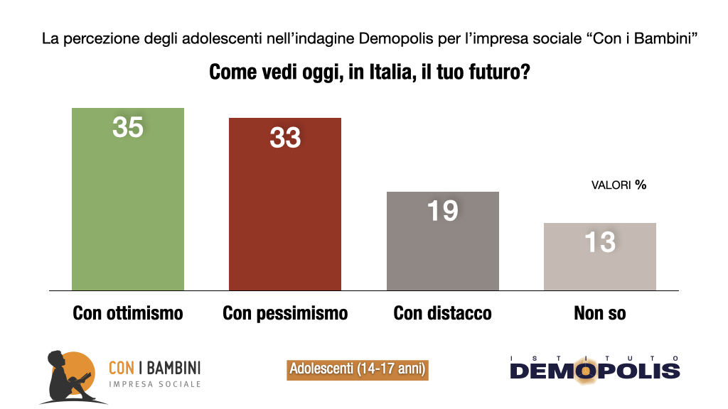Anche in ragione di una valutazione severa del contesto di vita che esperiscono, i ragazzi intervistati rivelano dosi di pessimismo smodate per l’età, ed in crescita costante. Solo il 35% dichiara di vedere, oggi in Italia, il proprio futuro con ottimismo. Ma il 33% si definisce pessimista, con un dato che sale di 10 punti fra i ragazzi delle periferie e dei quartieri “difficili”, e raggiunge il 73% fra i genitori italiani, che dimostrano di non saper offrire alle nuove generazioni puntelli ed esempi di fiducia cui ispirarsi.