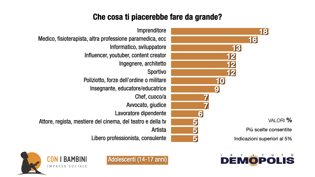 Ma che cosa vorrebbero fare da grandi gli adolescenti che vivono nelle periferie o nei quartieri più difficili? Quasi un quarto sogna di poter divenire medico o di lavorare nelle professioni sanitarie, il 18% vorrebbe divenire influencer o youtuber. Pragmaticamente, in misura significativa, viene citata dall’11% anche l’opzione di poter lavorare nelle forze dell’ordine o di divenire insegnanti o educatori.