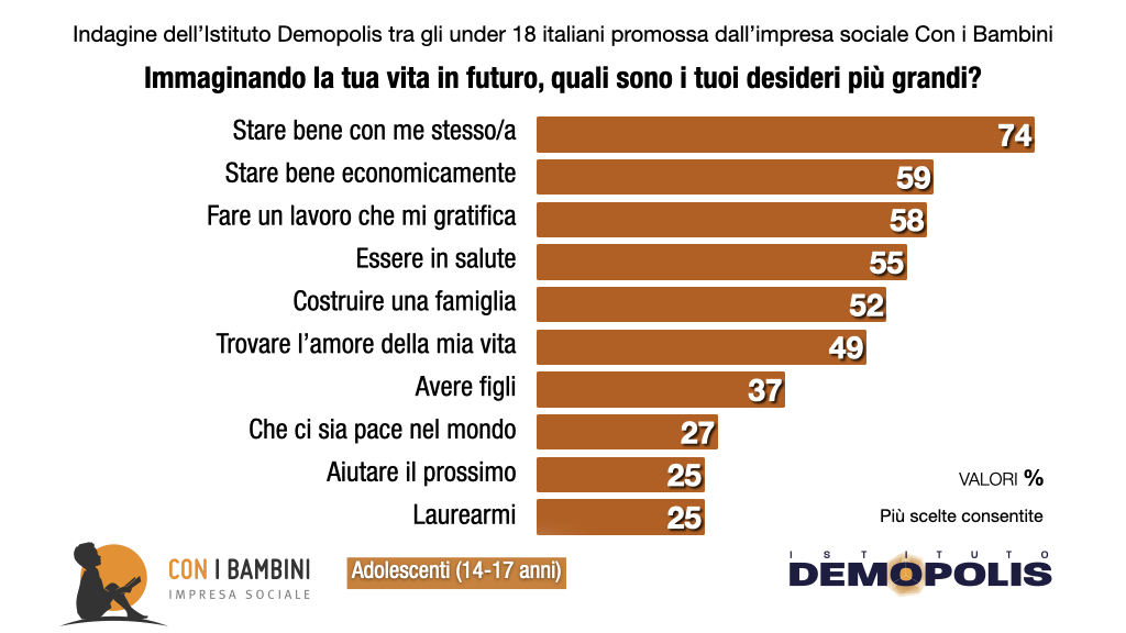 Immaginando la loro vita per il futuro, il primo fra i desideri degli adolescenti è in assoluto lo “star bene”: con loro stessi innanzi tutto, afferma il 74%. Ma anche economicamente, dicono quasi 6 su 10. Il 58% aspira alla realizzazione lavorativa ed il 55% si augura per di poter essere in salute.