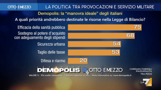 Demopolis per LA7: la Legge di Bilancio nell’opinione degli italiani Sondaggio Demopolis per Otto e Mezzo: le misure della Legge di Bilancio nell’opinione degli italiani. In studio con Lilli Gruber, Massimo Franco, Marco Travaglio, Giulio Tremonti